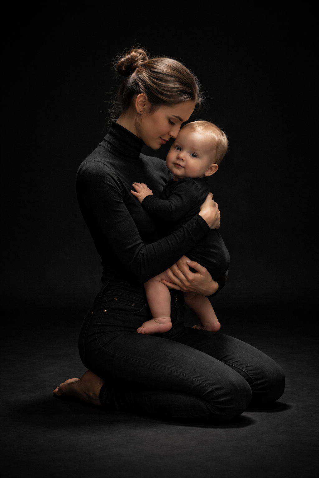 Podrás elegir entre fondo blanco o fondo negro. Si quieres ambos pregúntame por el suplemento. En ambos fondos utilizaremos una luz cenital para conseguir las fotos de retrato más tiernas.